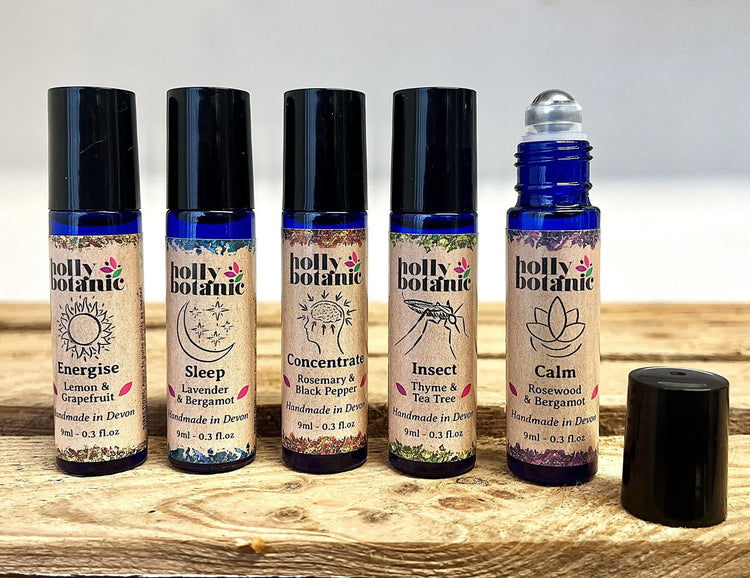Aromatic essential oil blends diluted in carrier oils in a handy roller ball bottle. Apply directly to skin on pulse points for aromatherapeutic benefits.